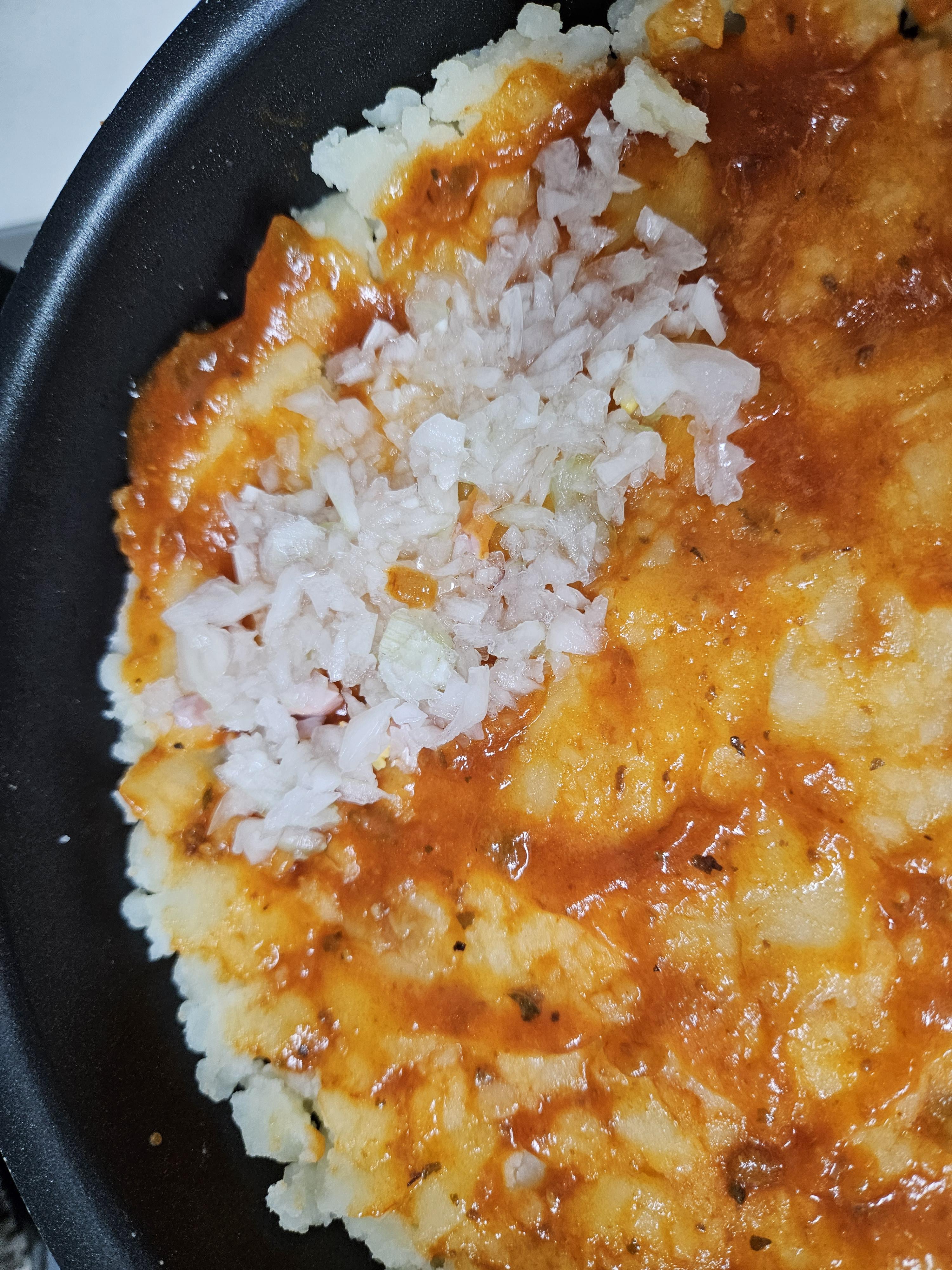 1. 으깨고 소금 간한 감자를 프라이팬에 깔아줍니다.