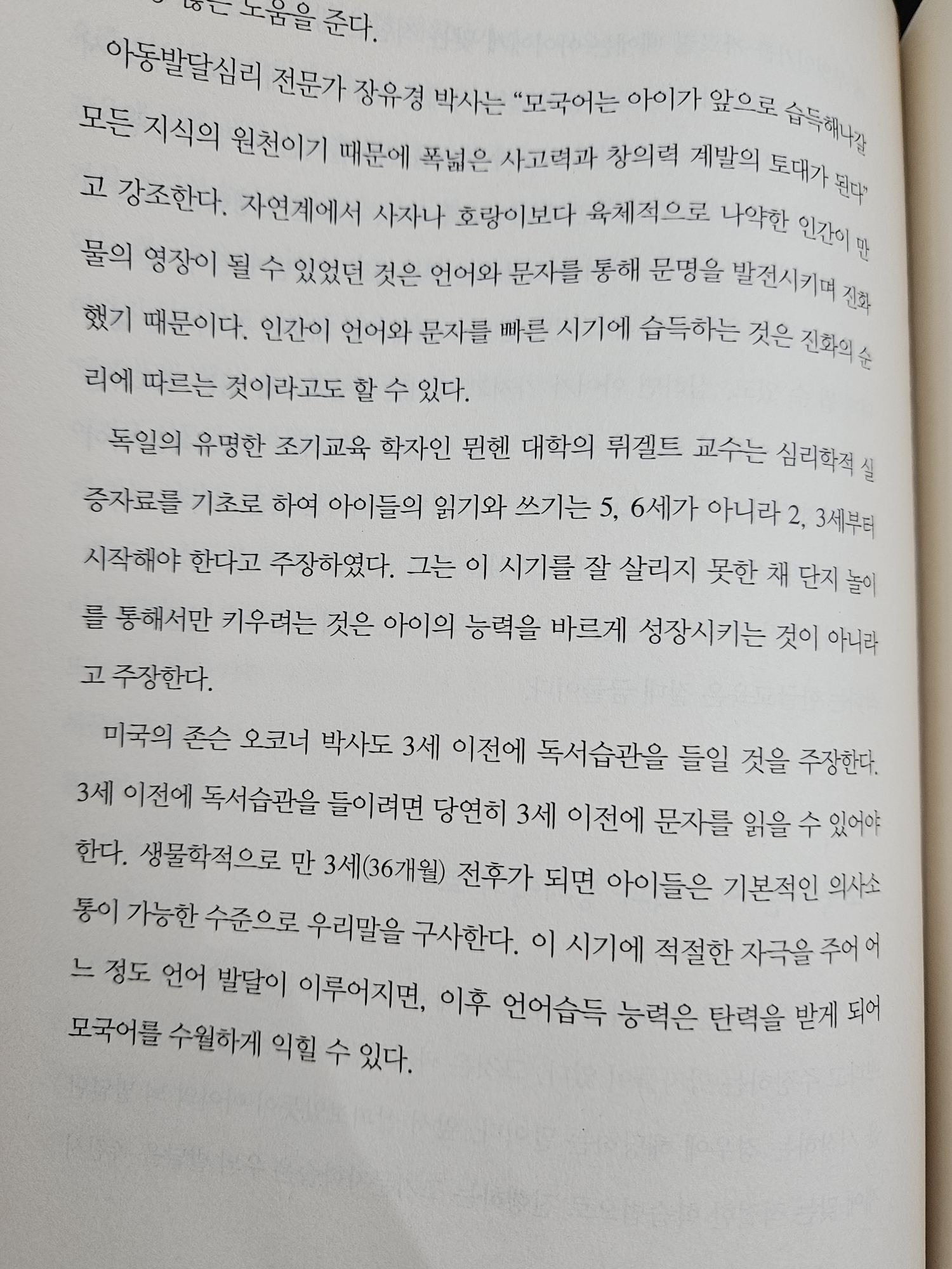 독일의 유명 조기교육 학자인 뮌헨 대학의 뤼겔트 교수는 심리학적 실증자료를 기초로 아이들의 읽기 쓰기는 5,6세가 아니라 2,3세부터 시작해야 한다고 주장하였다, 미국 존슨 오코너 박사도 3세 이전 독서습관을 들일 것을 주장.