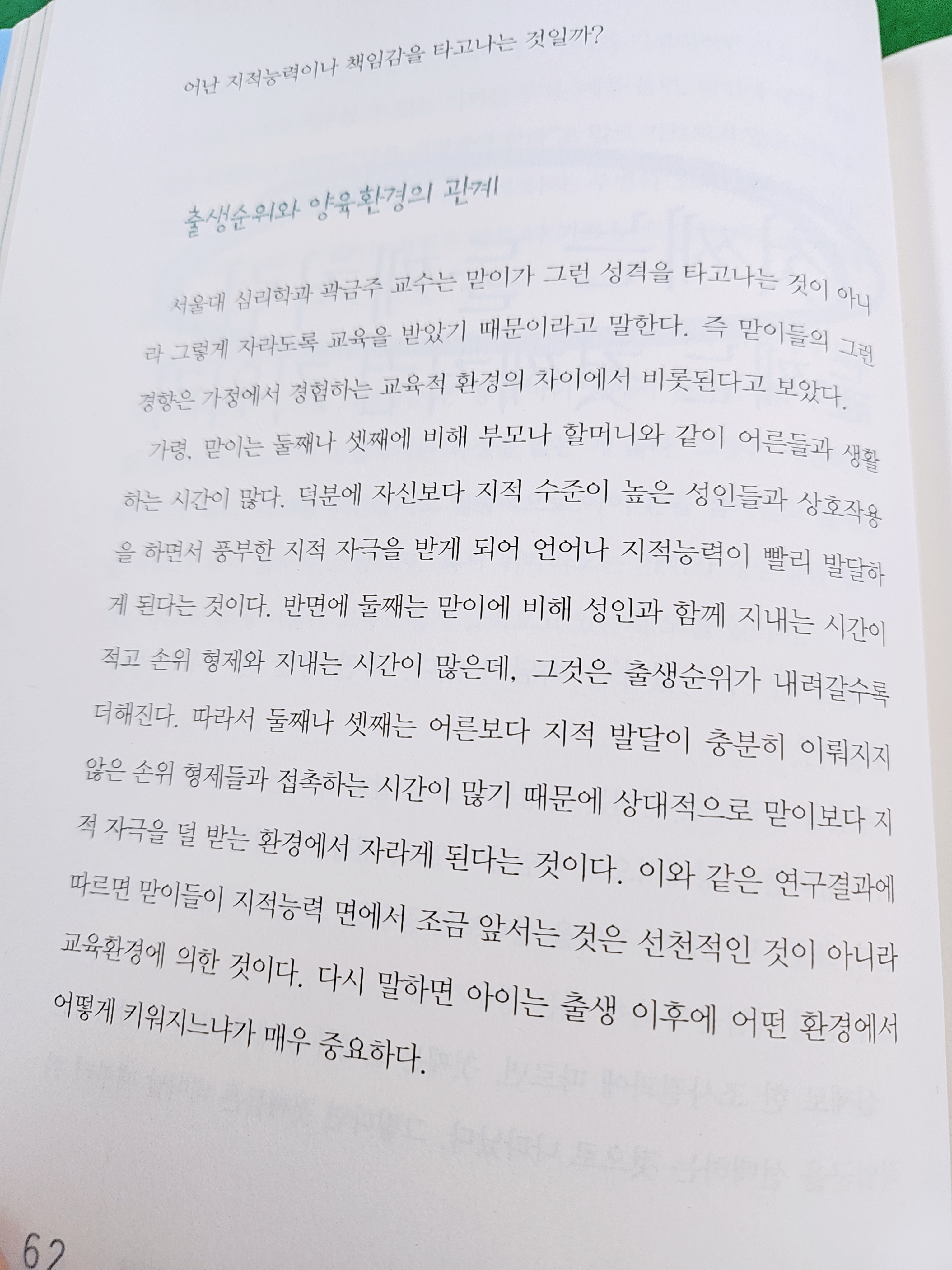 첫째형 교육방식: 첫째의 경우는 양육경험잉 전혀 없는 상태에서 아이를 낳기 때문에 엄마는 온갖 정성을 쏟게 된다. 아이 옆에서 금이야 옥이야 보살피며 한시도 자리에서 떠나지 못하고, 울음이라도 터뜨리면 안절부절못한다. 이와 같은 다뜻한 양육태도는 아이에게 정서적 안정감을 심어주고, 많은 지적 자극을 주게 된다. 지적수준이 높은 성인들과 상호작용하며 풍부한 자극 받게 되어 언어나 지적능력 빨리 발달.
