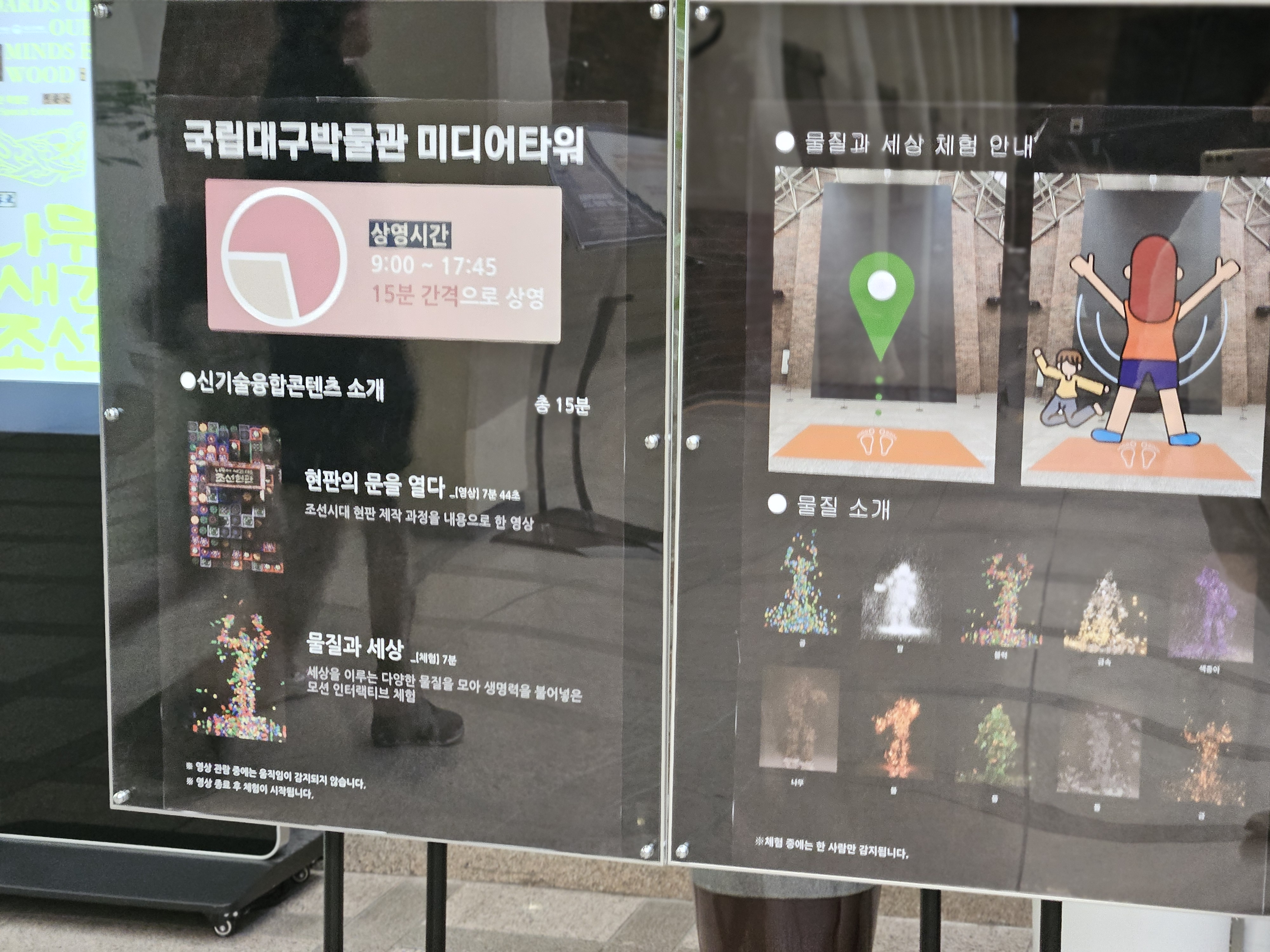 <물질과 세상> 전시 15분은 직접 체험할 수 있는 곳입니다. 발자국에 있는 곳에 서서 움직이면 화면의 사람?조형물?도 같은 동작으로 움직여요! 특히 아이들이 신나하며 참여하였어요!