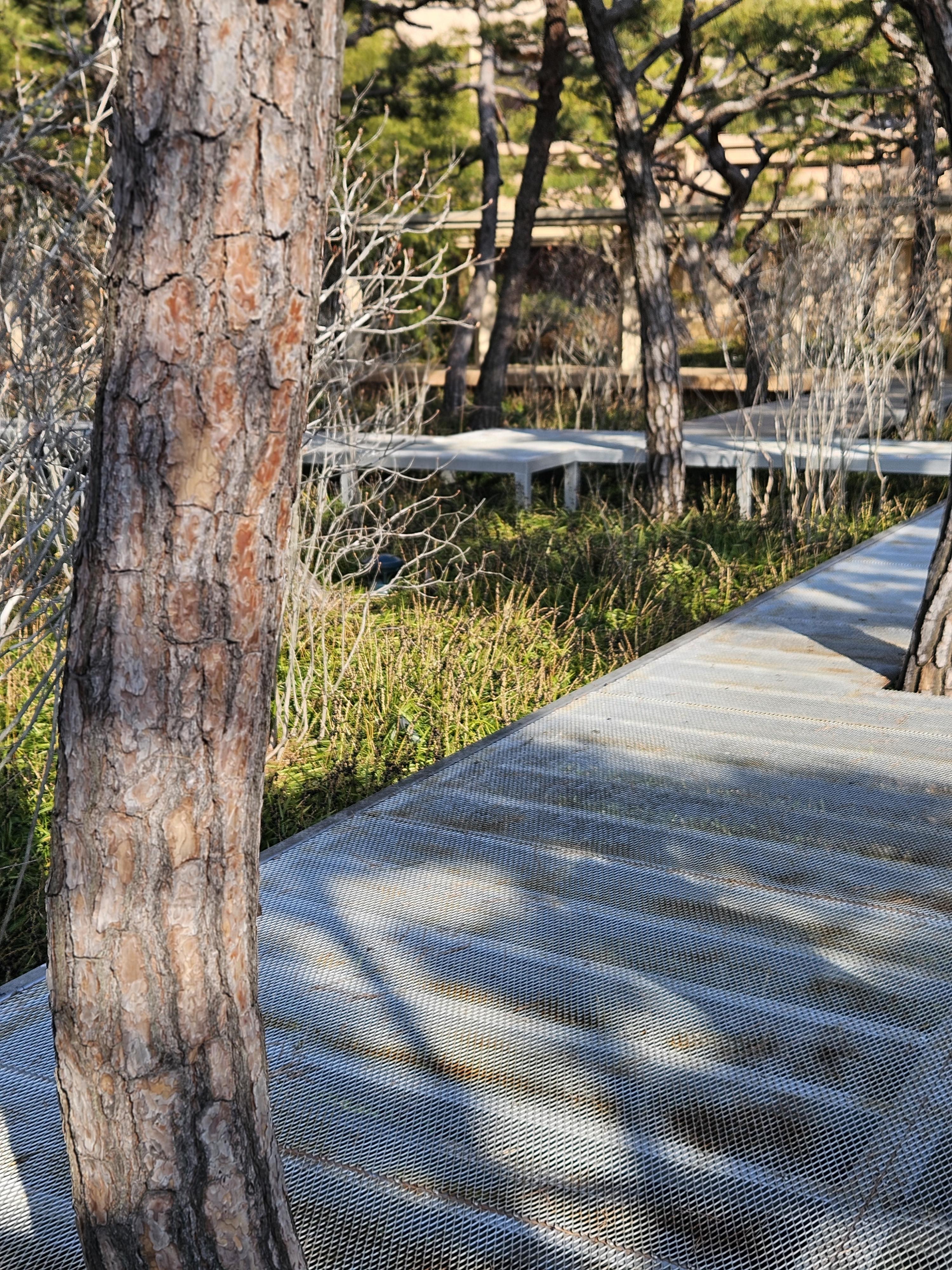 철제 다리 사이에 소나무 분재가 그대로 보존되어 있고, 아래로 내려가실 순 없어요!