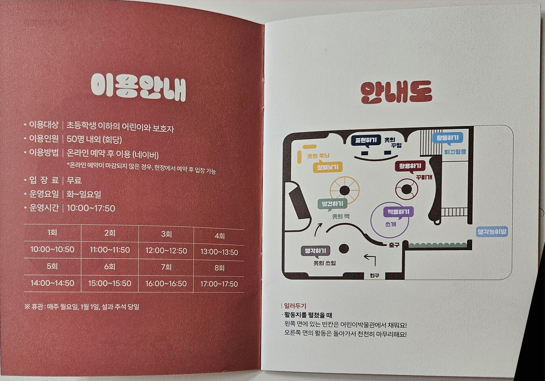 주말 또는 아이들 방학인 평일에도 자유롭게 방문하기 좋은 곳입니다.