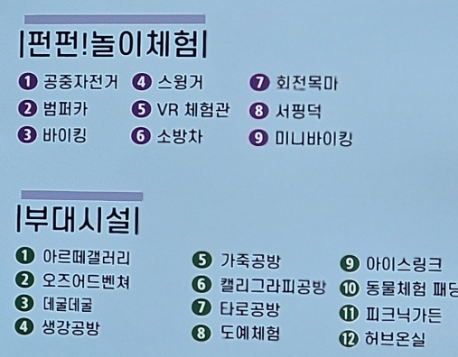 바이킹, 회전목마, 하늘자전거, 하늘비행기, 범퍼카 등.