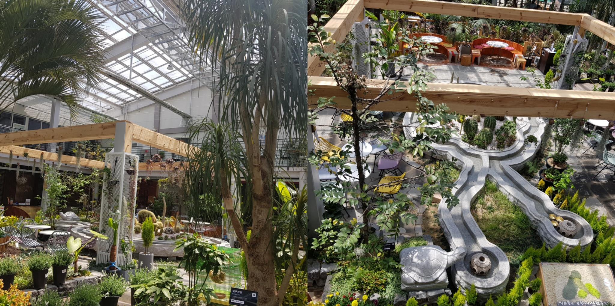 온실을 연상케 하는 실내 수목원 겸 꽃과 나무를 판매하는 화원이에요. 2층에는 카페가 있습니다. 입장료 없고, 식물을 구매해야 하는 강제적인 분위기 없어요. 거북이, 앵무새, 작은 동물들을 구경할 수 있어요! 2층에는 뷔페, 1층에는 농산물판매처가 있어 식사 및 식재료 구매 가능하세요. 야외에는 뽀로로 놀이터가 있어 아이들이 좋아해요. 아기와 어른 모두를 만족할 장소에요!