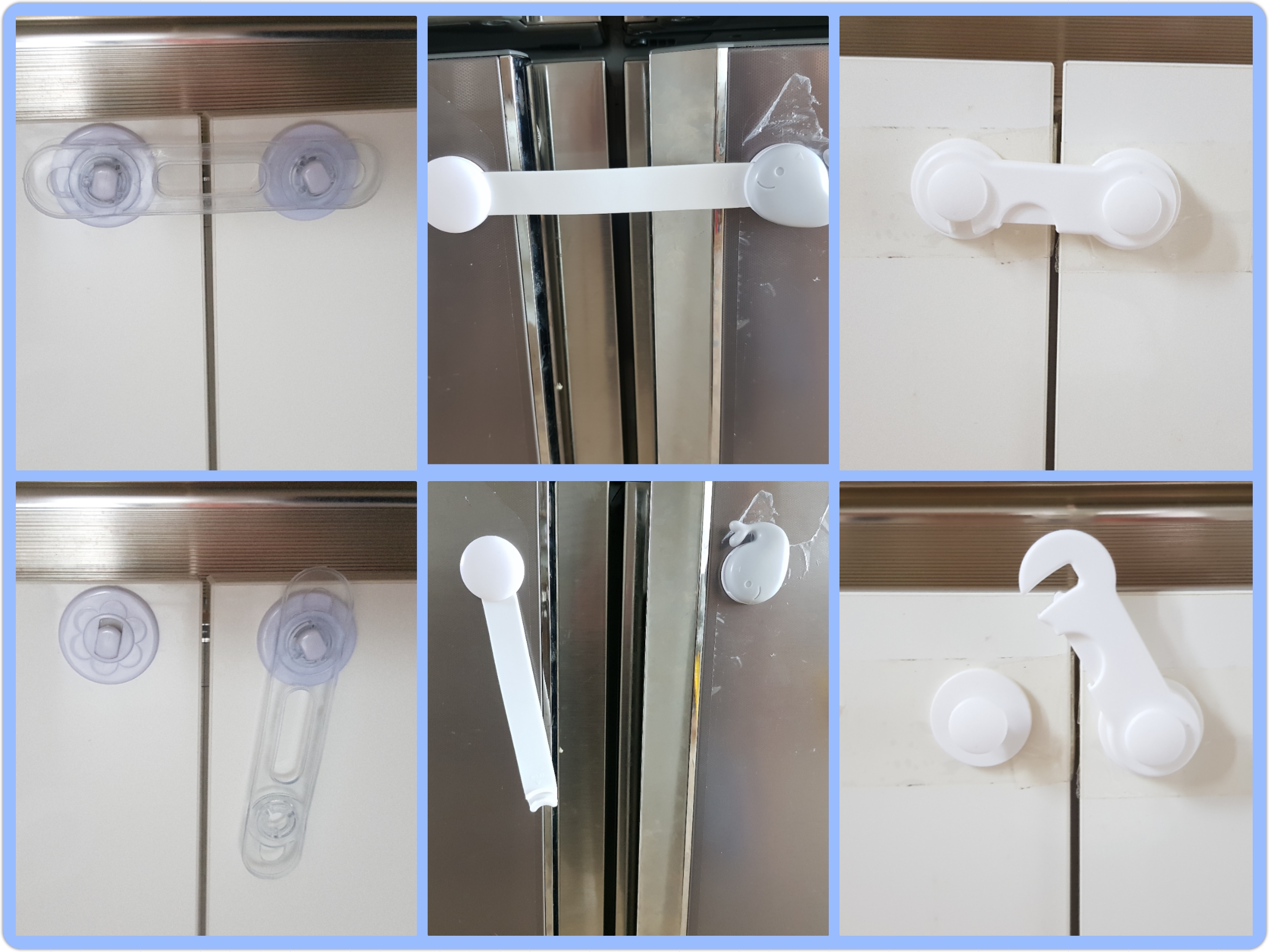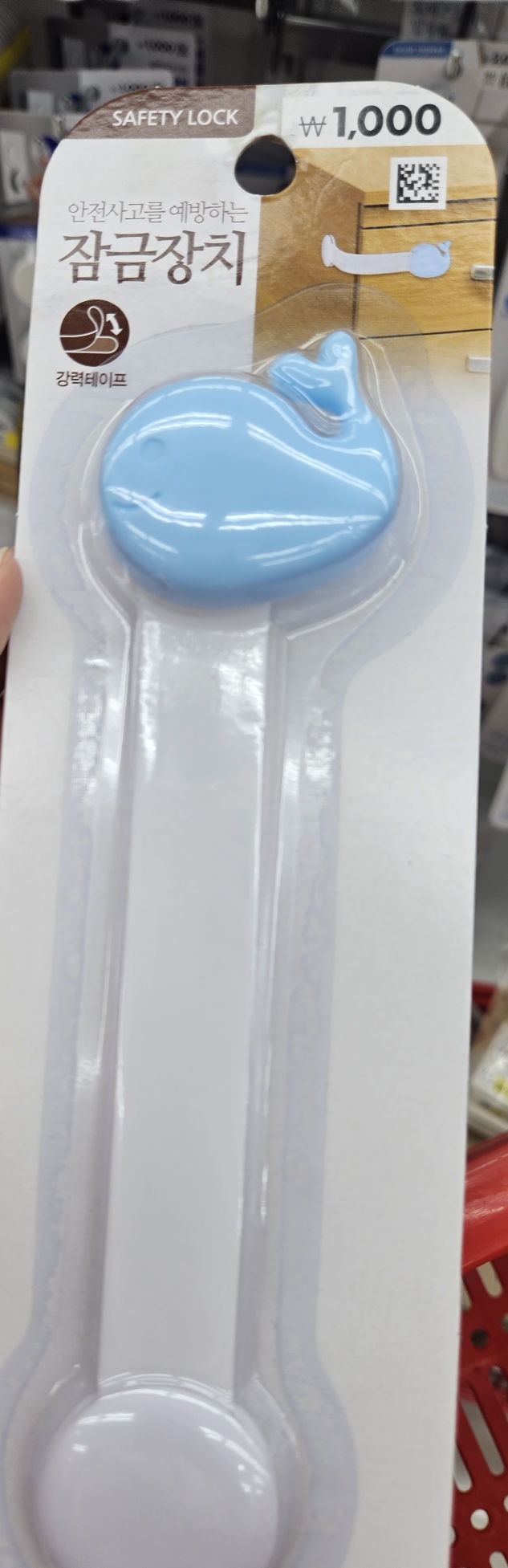 천원에 두 개. 가장 가성비 좋고 디자인도 무난한 편입니다. 버튼을 딸깍 누르며 위로 열었다가, 다시 버튼을 누르며 내려서 닫습니다. 간단하고 아기가 쉽게 열만큼 너무 간단하지도 않아요. 위로 열어야 하기 때문에 윗 공간이 조금 필요하다는 점이 단점이라면 단점일까요, 셋 중에는 제가 가장 만족한 문 잠금장치입니다:)